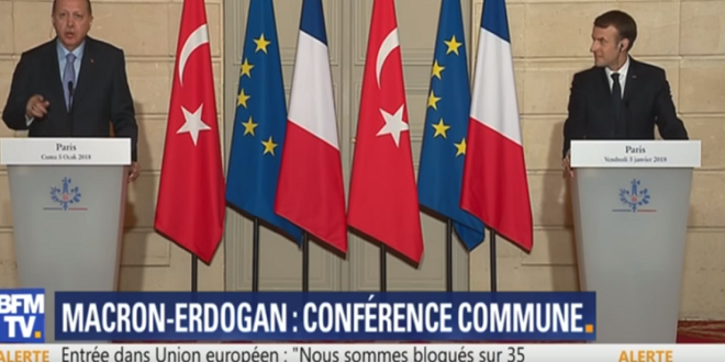 هاجم الرئيس التركي رجب طيب أردوغان في مؤتمر صحفي في باريس صحفيا فرنسيا سأله عن اتهامات لأنقرة بإرسالها أسلحة إلى سوريا، وطالبه بتوجيه السؤال لواشنطن بخصوص أسلحتها في سوريا.