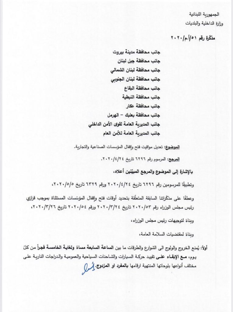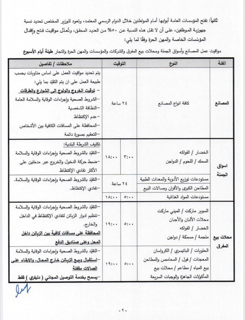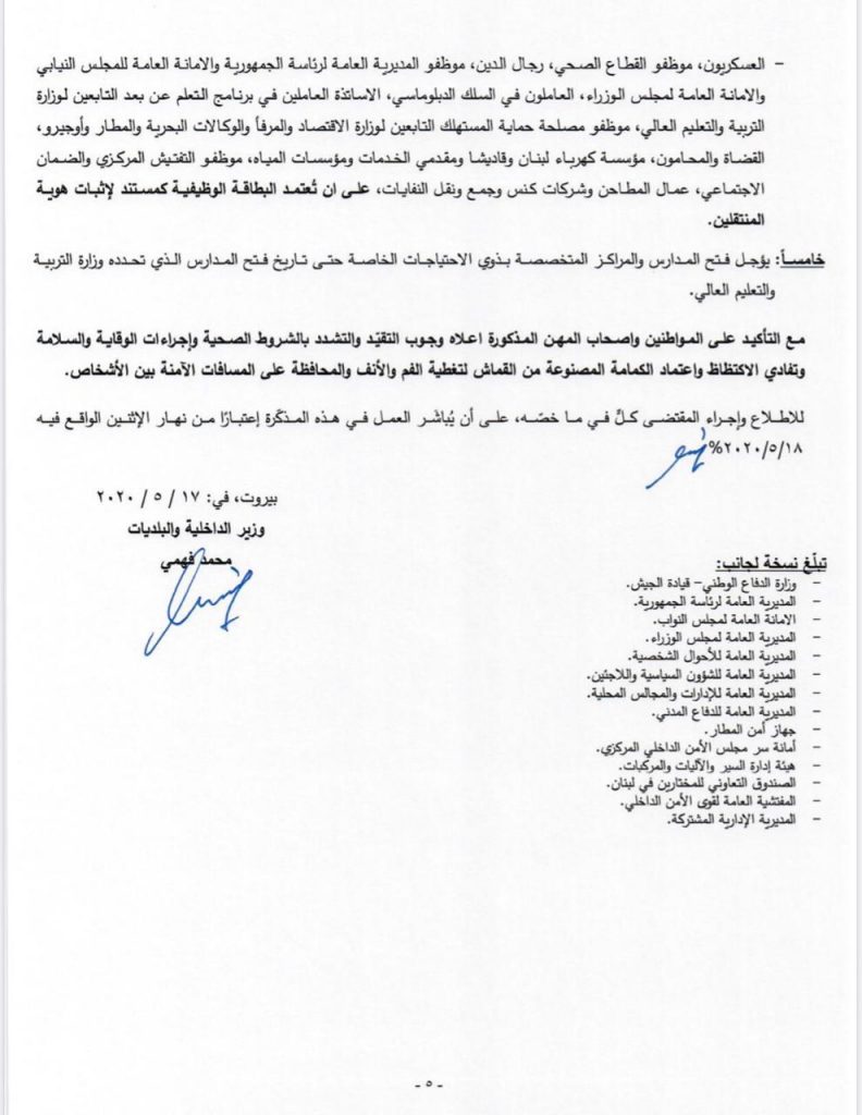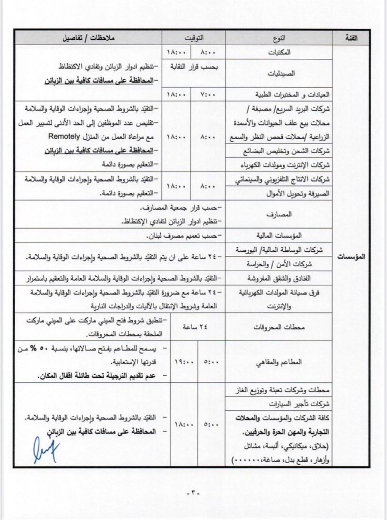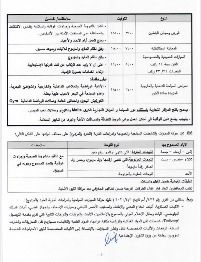 أعلن وزير الداخلية العميد محمد فهمي الاجراءات التي سترافق مرحلة اعادة فتح البلد. وفق الجدول الاتي