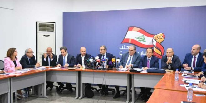 وقرر التكتل “تخصيص جلسته المقبلة لنقاش معمق حول السياسات والخيارات الاقتصادية والمالية والنقدية التي يتوجب على لبنان اعتمادها”.