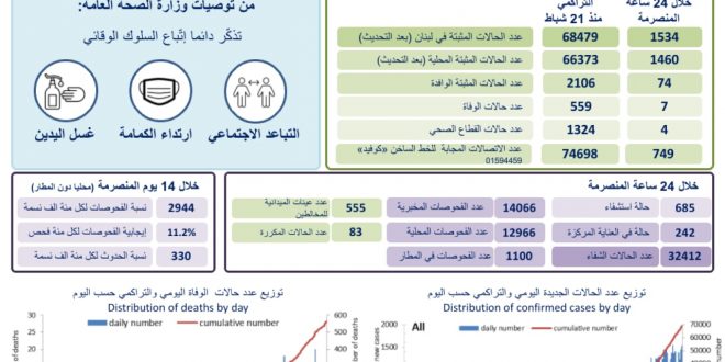 اعلنت وزارة الصحة العامة عن 1534 حالة مثبتة وعن وفاة 7 ليرتفع عدد الوفيات الاجمالي الى 559