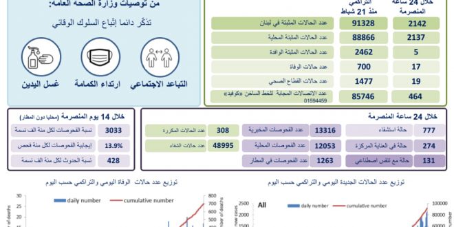 اعلنت وزارة الصحة العامة تسجيل 2142 اصابة كورونا جديدة رفعت العدد التراكمي للحالات المثبتة الى 91328.وجاء في التقرير:
