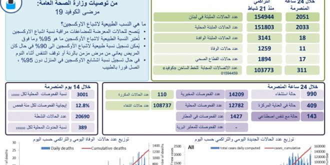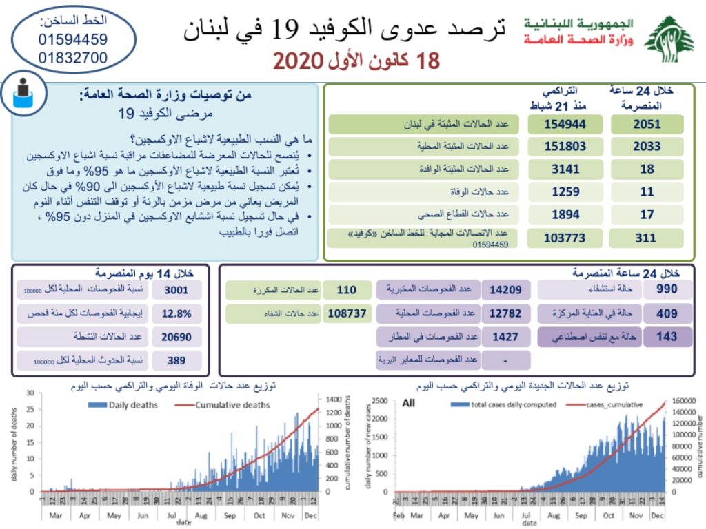 اعلنت وزارة الصحة العامة تسجيل 2051 اصابة كورونا جديدة رفعت العدد التراكمي للحالات المثبتة ال 154944. كما تم تسجيل 11 حالة وفاة. وجاء في التقرير: