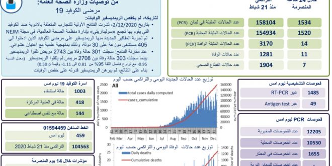 اعلنت وزارة الصحة العامة تسجيل 1534 اصابة كورونا جديدة رفعت العدد التراكمي للحالات المثبتة ال 158104. كما تم تسجيل 11 حالة وفاة. وجاء في التقرير: