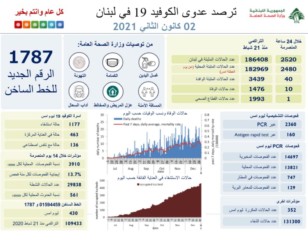 اعلنت وزارة الصحة العامة تسجيل 2520 اصابة كورونا جديدة رفعت العدد التراكمي للحالات المثبتة الى 186408. كما تم تسجيل 10 حالات وفاة. وجاء في التقرير: