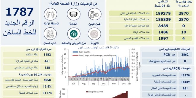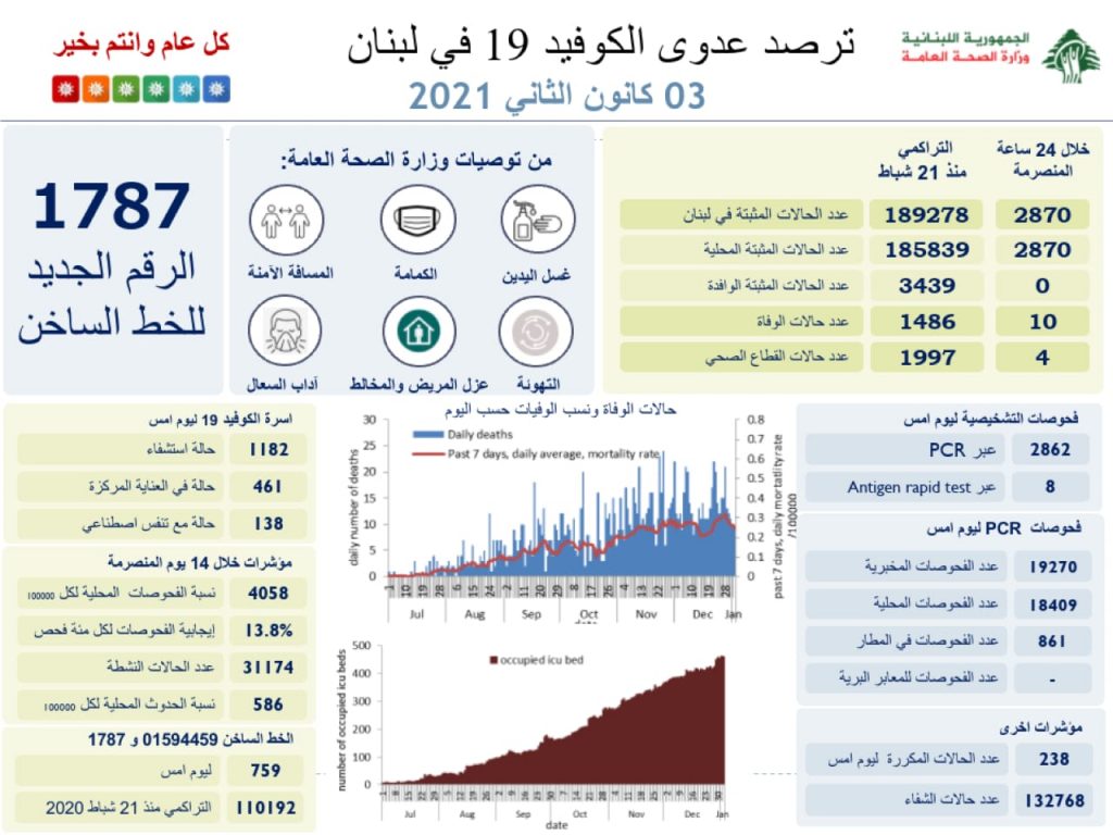 اعلنت وزارة الصحة العامة تسجيل 2870 اصابة كورونا جديدة رفعت العدد التراكمي للحالات المثبتة الى 189278. كما تم تسجيل 10 حالات وفاة. وجاء في التقرير:
