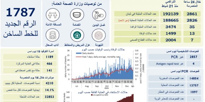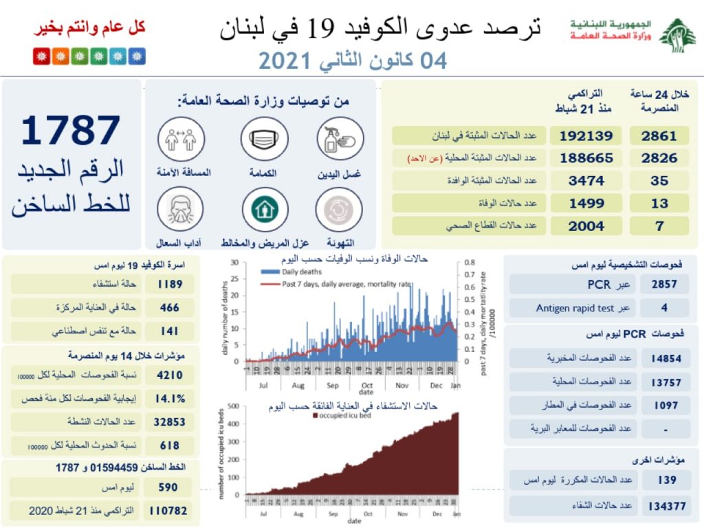 اعلنت وزارة الصحة العامة تسجيل 2861 اصابة كورونا جديدة رفعت العدد التراكمي للحالات المثبتة الى 192139. كما تم تسجيل 13 حالة وفاة. وجاء في التقرير:
