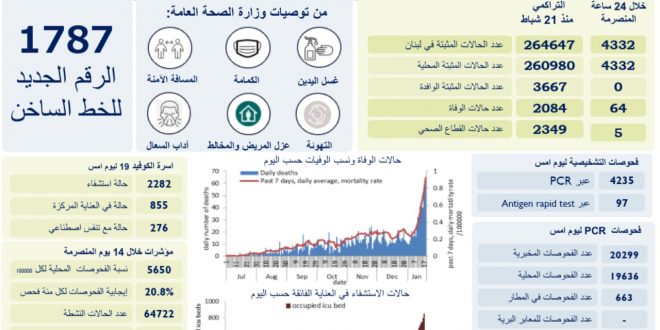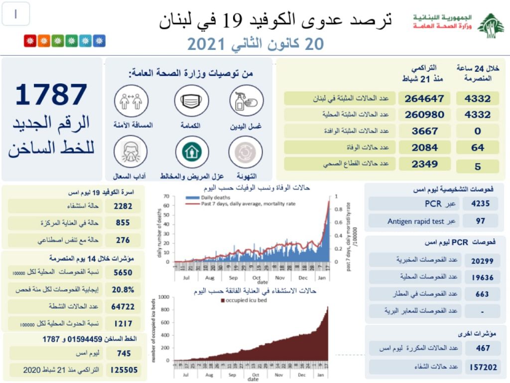 اعلنت وزارة الصحة العامة تسجيل 4332 اصابة كورونا جديدة رفعت العدد التراكمي للحالات المثبتة ال 252812. كما تم تسجيل 64 حالة وفاة. وجاء في التقرير: