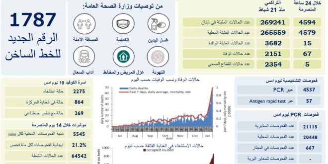 اعلنت وزارة الصحة العامة تسجيل 4594 اصابة كورونا جديدة رفعت العدد التراكمي للحالات المثبتة ال 269241. كما تم تسجيل 67 حالة وفاة. وجاء في التقرير:
