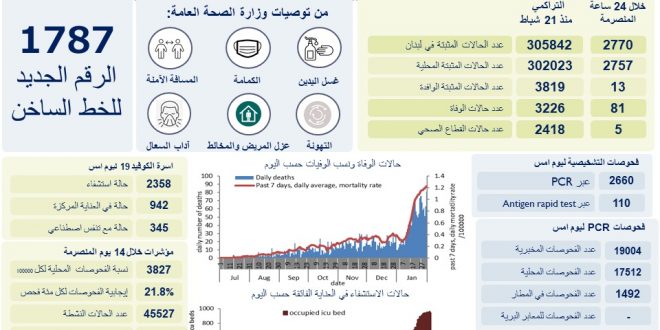 اعلنت وزارة الصحة العامة تسجيل 2770 اصابة جديدة رفعت العدد التراكمي للحالات المثبتة الى 305842. كما تم تسجيل 81 حالة وفاة. وجاء في التقرير:
