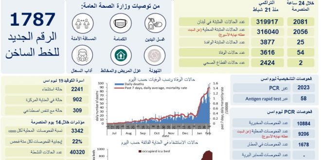 اعلنت وزارة الصحة العامة تسجيل 2081 اصابة جديدة رفعت العدد التراكمي للحالات المثبتة الى 319917. كما تم تسجيل 54 حالة وفاة. وجاء في التقرير: