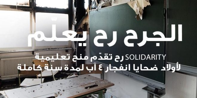 أطلقت جمعية “معًا في المحن “SOLIDARITY” مبادرتها الجديدة المخصصة لأولاد ضحايا انفجار 4 آب أو أحد أفراد عائلة الضحية التي ليس لها أولاد، كما لمن أصيبوا بإعاقات تمنعهم من العمل لتأمين مستلزمات تعليم أولادهم في المدارس والجامعات في لبنان.