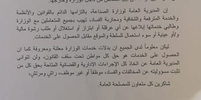 ان المديرية العامة لوزارة الصناعة، بالتزامها الدائم بالقوانين والأنظمة والخدمة المترفعة والشفافية ومحاربة الفساد، تهيب بجميع المتعاملين مع الوزارة وطالبي خدماتها ابلاغها عن أي عرقلة او ابتزاز او استغلال او طلب رشوة مالية و/أو عينية او سوء استعمال للسلطة والموقع مقابل الحصول على الخدمات.