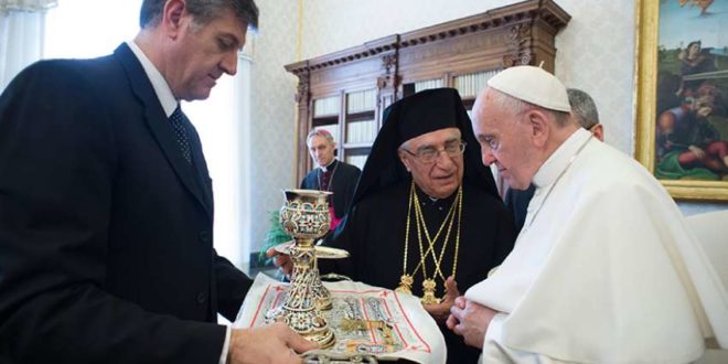 التقى بطريرك أنطاكية وسائر المشرق للروم الكاثوليك يوسف العبسي البابا فرنسيس في الفاتيكان، بهدف الاحتفال بقداس الشراكة الكنسية، في حضور مطارنة السينودس الذي عقد بداية الشهر الحالي في المقر البطريركي في الربوة.
