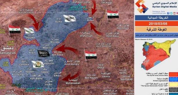 استحوذ الجيش السوري على نصف مساحة الغوطة، وفتح معبر إنساني جديد جنوب الغوطة الشرقية مقابل بلدة جسرين.