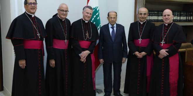 استقبل رئيس الجمهورية العماد ميشال عون قبل ظهر اليوم، وفدا من المطارنة الكاثوليك في الولايات المتحدة الاميركية، ضم رئيس اساقفة الخدمات العسكرية رئيس “لجنة العدالة الدولية والسلام” في الكنيسة الكاثوليكية الاميركية المطران تيموتي بروغليو، رئيس اساقفة دنفر المطران صامويل اكيلا ورئيس اساقفة “SALT LAKE CITY” المطران اوسكار سوليس، في حضور راعي ابرشية نيويورك المارونية المطران غريغوري منصور وراعي ابرشية لوس انجلوس المارونية المطران الياس عبد الله زيدان.