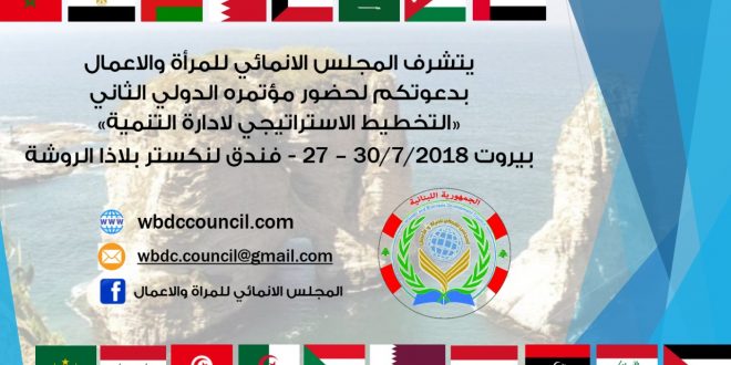 يعقد المجلس الانمائي للمرأة والأعمال مؤتمره الدولي الثاني تحت عنوان “التخطيط الاستراتيجي لادارة التنمية “قيادة وريادة بالتعاون مع منظمات ومؤسسات إقليمية ودولية وغرف تجارية في العاصمة اللبنانية بيروت في 30/7/2018- 27