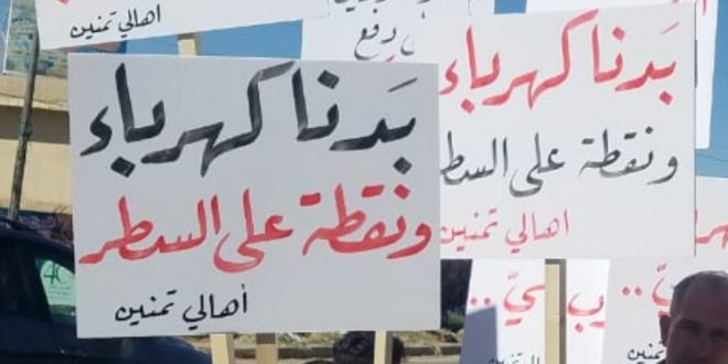 نفّذ أهالي بلدة تمنين التحتا قبل ظهر اليوم وقفة احتجاجية على اوتوستراد رياق- بعلبك بسبب التقنين الحاد في التيار الكهربائي الذي يتسبب بانقطاع مياه الشفه رافعين لافتات كُتب عليها شعارات تعبّر عن معاناتهم المزمنة، و تحدّث باسم الأهالي عضو مجلس بلدية تمنين التحتا يحيى سمعان بكلمةٍ جاء فيها :” نقف هنا اليوم ليس لأننا نهوى قطع الطرقات بل لأننا لم نعد نحتمل الإهمال و الإجحاف بحق بلدتنا التي يسكنها أكثر من 20,000 نسمة”. أضاف، “أردنا من خلال هذه الوقفة أن نرفع الصوت و نعبّر عن حجم معاناتنا في بلدة تمنين التحتا، هذه المعاناة الناتجة عن التقنين الحاد في التيار الكهربائي و الذي ينعكس على تأمين مياة الشفه للبلدة، و انقطاع التيار الكهربائي أنعش شراء مياه الشفة من الصهاريج التي لا يتوقف هديرها ليلاً نهاراً لأن الحاجة للمياه ازدادت مع بداية فصل الصيف و زيادة الطلب على المياه أدت إلى رفع أصحاب الآبار الخاصة ثمن الصهريج سعة 20 برميل إلى 25000 ل.ل، و انقطاع التيار الكهربائي الحاد أدّى إلى رفع أصحاب المولدات سعر الكيلو وات بالساعة خلافاً لتسعيرة وزارة الإقتصاد التي لا يلتزمون بها”.