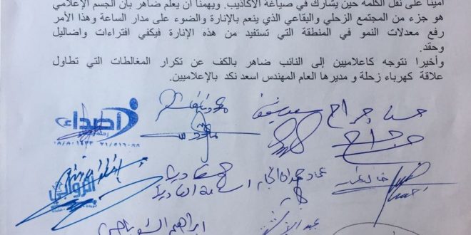 رفض اصحاب ومسؤولو الصحف و الاذاعات و التلفزيونات والمواقع الالكترونية في زحلة والبقاع ما أسموه حملة الاضاليل والافتراءات التي يدأب عليها النائب ميشال ضاهر في حق شركة كهرباء زحلة والتي طالت أيضا الجسم الإعلامي الذي اعتبره ضاهر بأنه من المرتشين وعليه فإننا نحن الموقعين أدناه نطالب النائب ضاهر بالاعتذار عما تناوله من افتراءات طالت الإعلاميين والكف عن هذا الأسلوب الرخيص والكل يعلم كيف يتصرف ضاهر في الموضوع الإعلامي وخصوصا الإعلام المرئي وكيف ينفق مئات الآف من الدولارات لنقل مؤتمراته الإعلامية والأهم أن الكل في لبنان يعرف حجم المال الانتخابي الذي انفقه ضاهر على وسائل الإعلام. وهنا نسأل هل يكون الإعلام حرا حين يشارك ضاهر في حملة الاضاليل والافتراءات وهل يكون الإعلام أمينا على نقل الكلمة حين يشارك في صياغة الأكاذيب. ويهمنا أن يعلم ضاهر بأن الجسم الإعلامي هو جزء من المجتمع الزحلي والبقاعي الذي ينعم بالإنارة والضوء على مدار الساعة وهذا الأمر رفع معدلات النمو في المنطقة التي تستفيد من هذه الإنارة فيكفي افتراءات واضاليل وحقد. وأخيرا نتوجه كاعلاميين إلى النائب ضاهر بالكف عن تكرار المغالطات التي تطاول علاقة كهرباء زحلة و مديرها العام المهندس اسعد نكد بالإعلاميين.