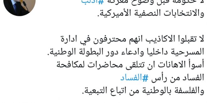 اضاف لا تقبلوا الاكاذيب انهم محترفون في ادارة المسرحية داخليا وادعاء دور البطولة الوطنية.