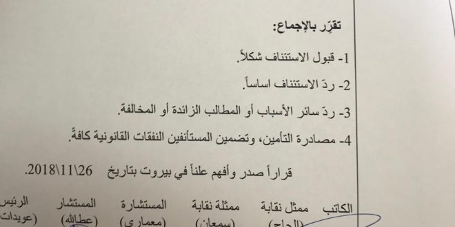 بتاريخ25 تموز 2018 تقدم كل من اعضاء مجلس نقابة الأطباء في بيروت الحاليين الأطباء مريم رجب ومؤنس كلا كش وجورج الهبر وباسم أبو مرعي وعضو مجلس النقابة السابق الطبيب جوزيف حداد بوكالة المحاميين نديم مصطفى قوبر ومحمد أسد صفصوف باستئناف بوجه نقابة الأطباء في بيروت طعنا بالقرار الصادر عن مجلس النقابة في جلسته بتاريخ 10 تموز 2018 و القاضي بنقل و تبادل صلاحيات بين أمين السر و أمين الصندوق في حال الغياب أو الاعتكاف أو التمنع و ذلك تسييرا لعمل النقابة بعد امتناع أمين السر المنتخب عن ممارسة مهامه.