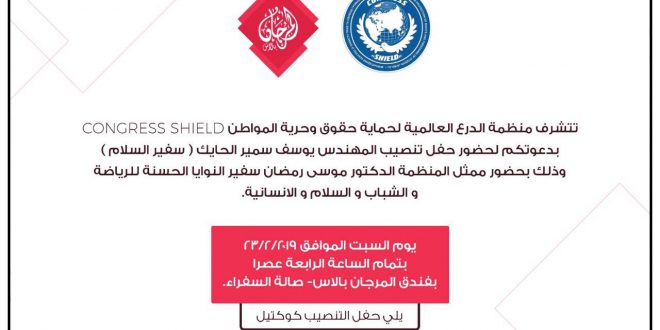 دعت منظمة الدرع العالمية لحماية حقوق وحرية المواطن العضو بدائرة الشؤون الاجتماعية والانسانية بالامم المتحدة الى حفل تنصيب المهندس يوسف الحايك سفيرا للسلام بحضور ممثل المنظمة الدكتور موسى رمضان سفير النوايا الحسنة للرياضة والشباب والسلام والانسانية